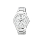 Womens Quartz Eco-Drive Silver-Tone Watch Mother-of-Pearl Dial 2,065 Points Polished silver-tone stainless steel braceletMother of Pearl dial with white and silver-tone hour markersEco-Drive technology - runs on light and never needs a battery replacementSwarovski crystals fitted along entire bezel3 Subdials: Day of the week Day of the month and 24-HoursFold over clasp with push button closureQuartz movementCitizen logoCase diameter: 35mmWater resistant to 30 M ... Item View » |