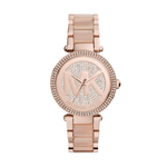 Ladies Parker Rose Gold-Tone Crystal Pave Watch Crystal RG Dial 4,989 Points Parker is a timepiece trimmed with sparkling crystal stones and elegant extrasRose gold-tone stainless steel H-link braceletCrystal stone paved dial with polished rose gold-tone âMKâ emblemRose gold-ton stainless steel case and fully paved crystal stone bezelDial also features rose gold-tone three hands and Michael Kors logoDouble push button fold over deployant closureMineral crystal dial windowCase size: 39mmWa ... Item View » |